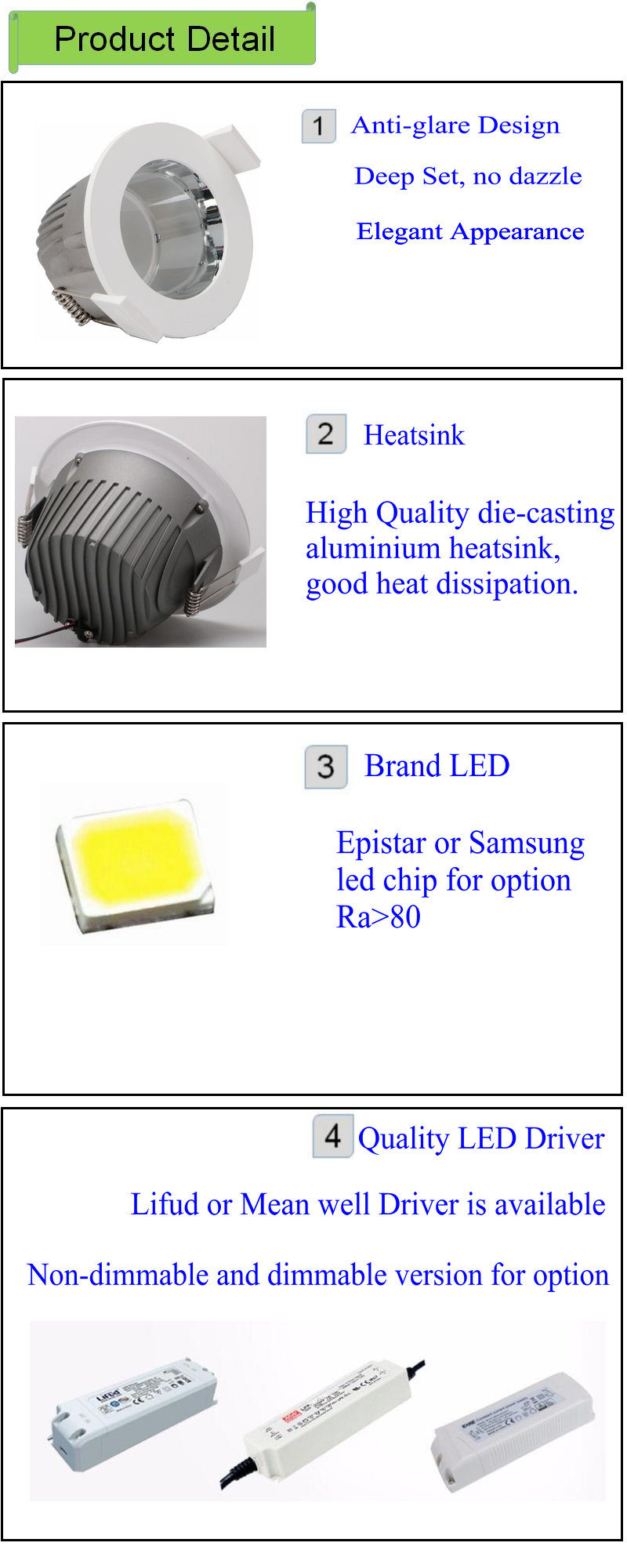 1.High end and elegant design, deep set anti-glare recessed Led Downlight.