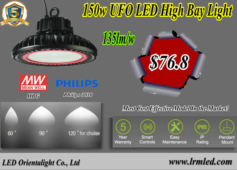 Promotion offer for 150w UFO led high bay $76.8, expiration date March.31, Philips 3030 leds,Meanwell HBG driver, 5 years warranty, 135lm/W.