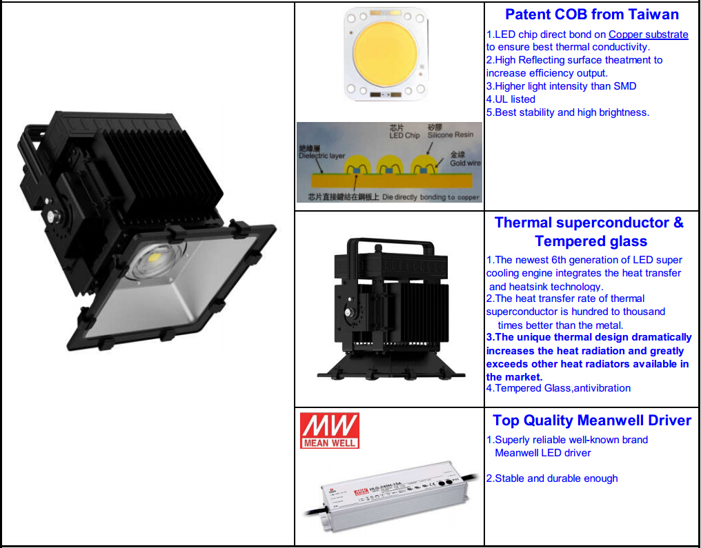 ·Adopting imported patent COB from Taiwan, UL listed, stable and durable enough, which have more intensive lighting, better perforance and longer lifesapn than SMDs for such high power led flood light.