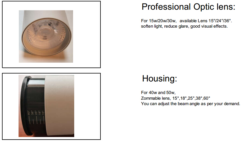 50w Zoomable LED track light is with an adjustable lens, which can make you achieve multiple choice for different beam angle with one fixture. This zoomable 50w LED track Light is very suitable for museum accent lighting, which can make the objects look more attractive and vivid.50w Zoomable LED track light can also well-suited for various commercial and residential applications such as store, shop, supermarket, showrooms, retail shops,art galleries, offices and dining rooms,etc.