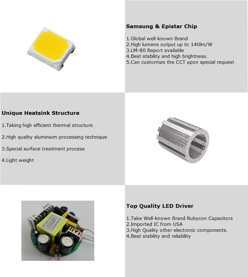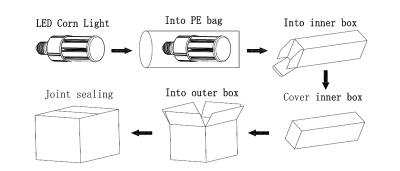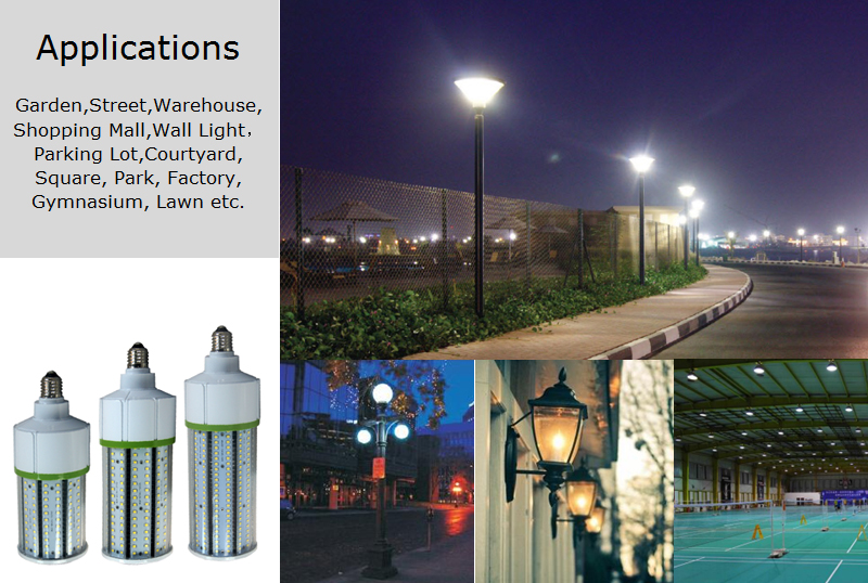 LED Corn Light mainly used in garden, street, warehouse, shopping mall, wall light, parking Lot, courtyard, square, park, airport, subway, gymnasium, etc.. Can be used in the indoor or outdoor IP65 or IP67 closed fixtures.